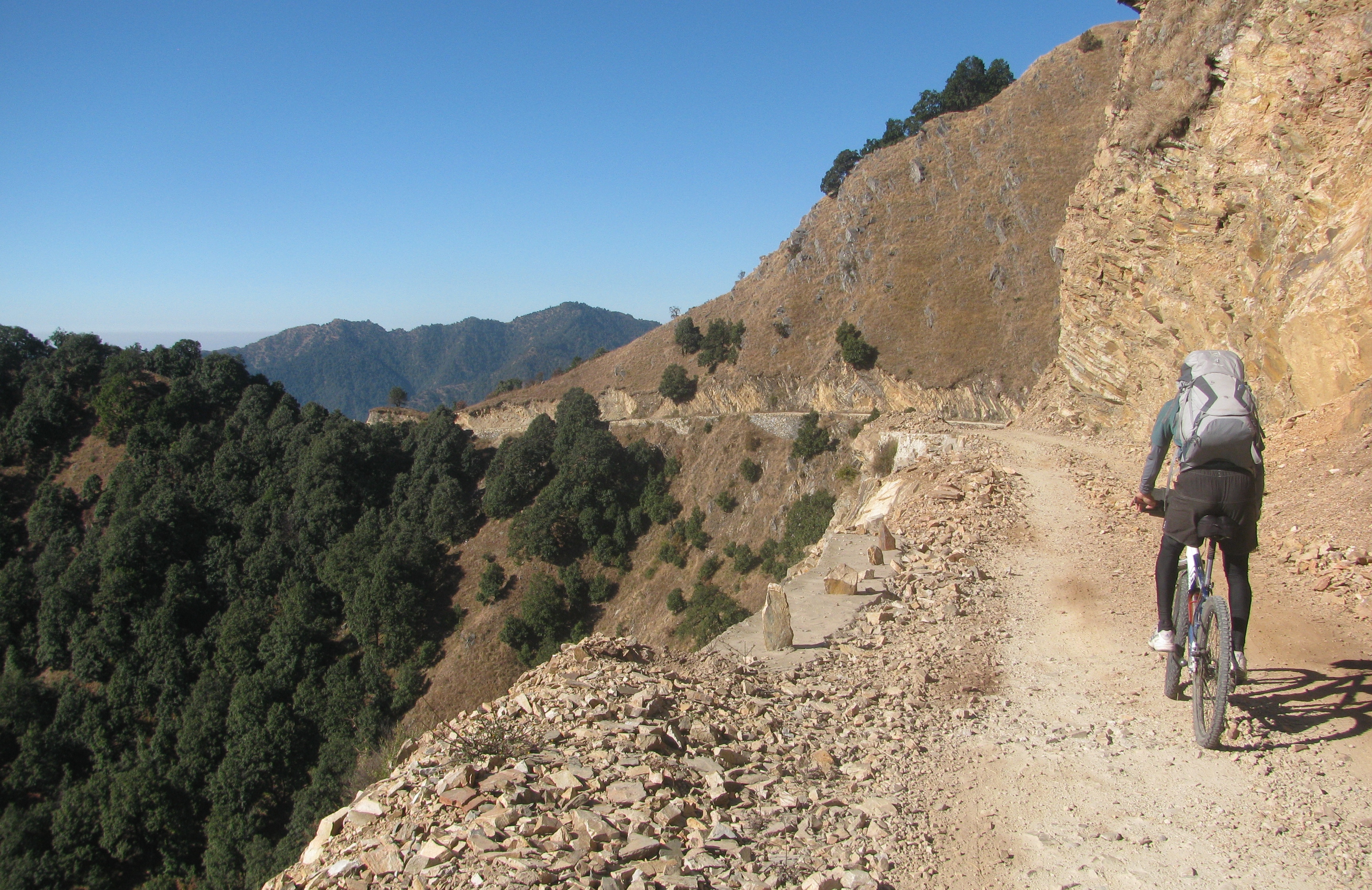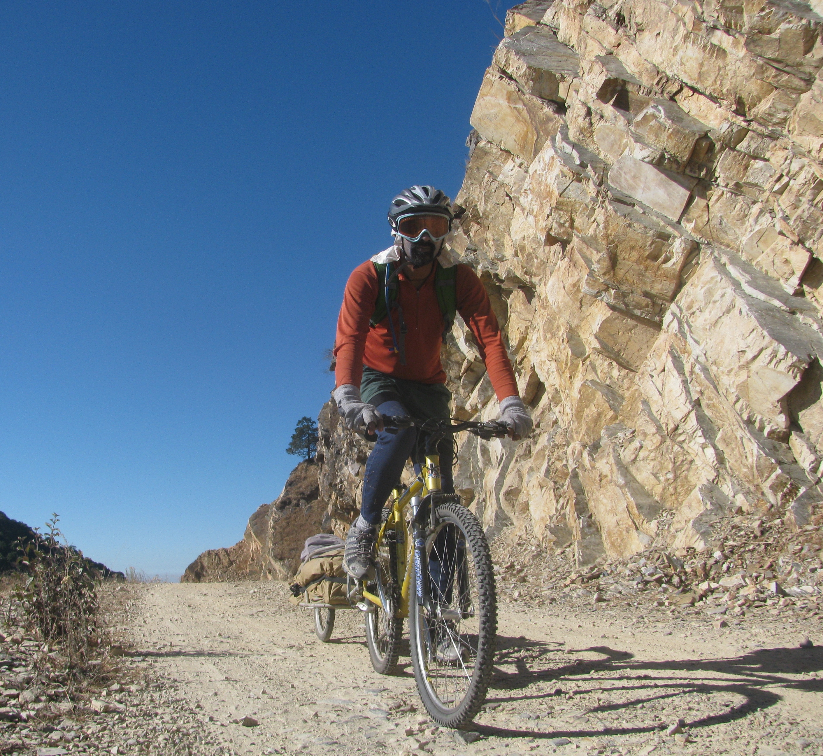 Sometimes a trip happens that is so enjoyable that you don’t remember to keep a diary and you can’t subsequently recall where you had been. This cycle trip was in that league. Not more than ten days. Approximately 350-400km covered in the hills; two mountain bikes, one trolley (attached to a cycle) with camping gear, stove, spare clothes, repair kit and food (essentially tea and coffee for the morning), two small backpacks on us. We didn’t have panniers. So this arrangement seemed best. Real cyclists may call us crazy. But we weren’t that real in cycling. We had no goals; we just wished for a nice, winding hill road with camping spot and tea shops en route. Besides, I suspect when one’s grounding is in hiking and mountaineering, some weight to haul, getting roasted by the effort, grinning through it and then laughing at the eccentric fool one is – it all adds to life. When the sun was unbearably hot, we stopped and slept in the shade. When a place seemed particularly beautiful, we stopped to marvel at it. When the road was well-made and there was no traffic, we relaxed into the ride. When a terribly rough side road assured to host great Himalayan views beckoned, we ventured forth thankful that our cycles had suspensions. We had destination but none so iron clad that we couldn’t let an instance lead to another – that seemed our trip.