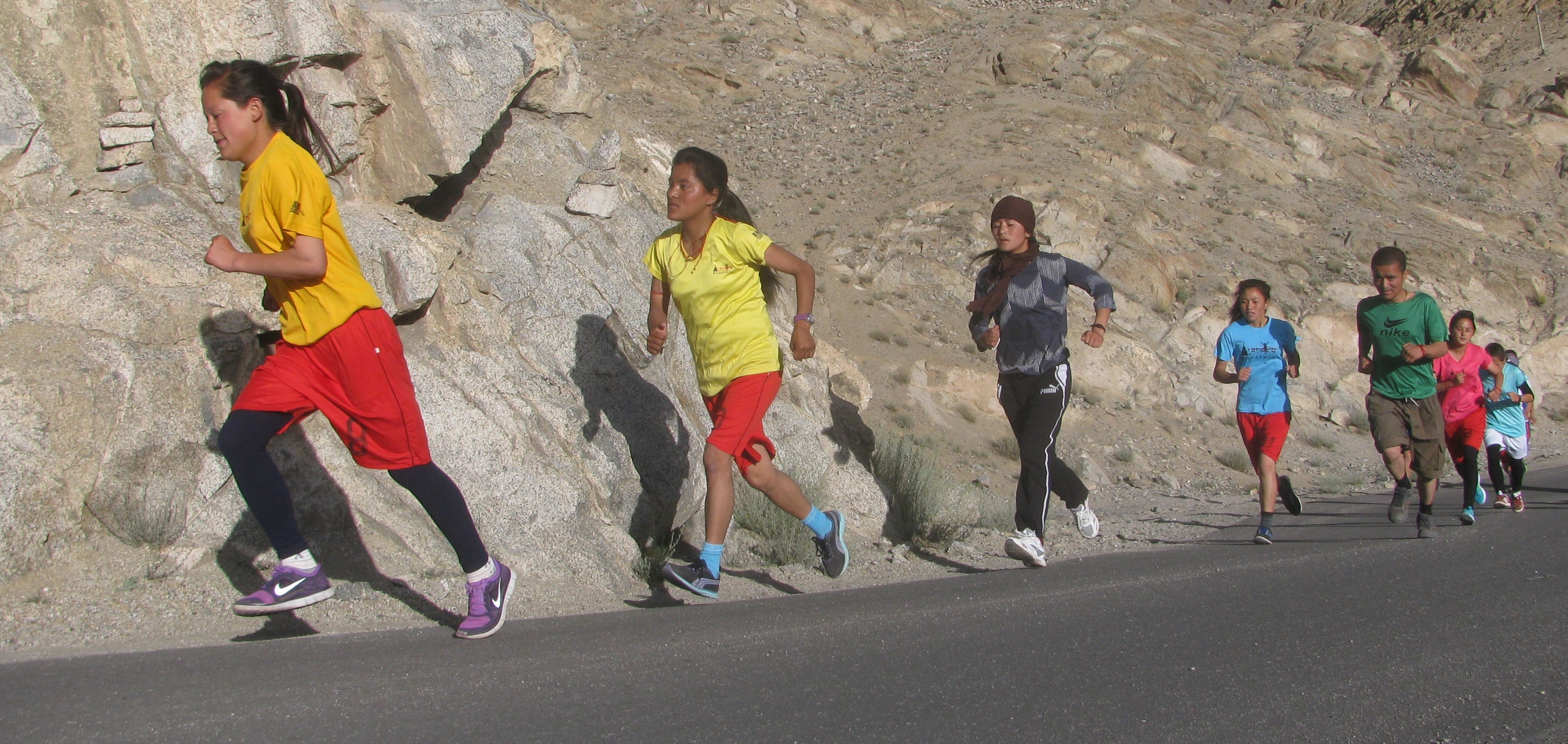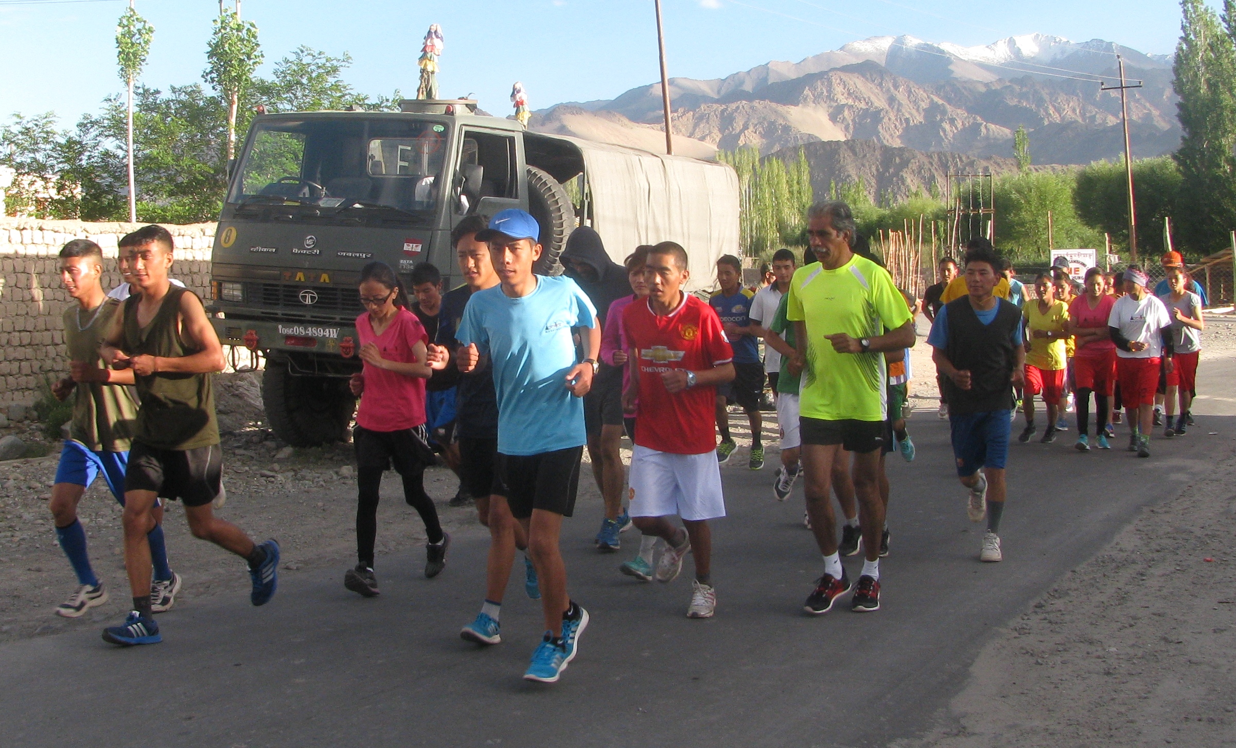 I was in Chubi, Leh; on the road leading from the police station to Lamdon School and beyond that to Khardung La. Leh had been experiencing intermittent showers. It lowered the warm temperatures of July, added an occasional passing chill. A middle aged man in track pants and T-shirt slowly jogged up the road. I watched his uphill progress recalling my attempted running near Khardung village in 2011. My sea level-physiology had heaved and puffed like a steam engine. The jogger floated by smoothly, legs working effortlessly, a calm demeanour on his face. My flared nostrils and gaping mouth from four years before flashed past in the mind. Well! – I told myself; its one life and you can’t be everything, can you? Make your peace with what you got. Cool mornings are good for healing philosophies. Five girls jogged down from the Lamdon side. That was six joggers in fifteen minutes of standing by the road. A white SUV slowed down to pick me up. “ Good morning,’’ Chewang Motup said. Beside him in the front seat was one of Mumbai’s best known coaches for long distance running, Savio D’Souza.