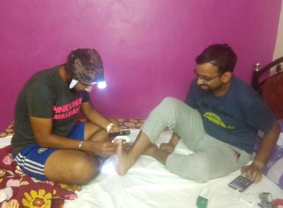 Inderpal attends to the blisters Jayaraman accumulated through the first six days of running. The blisters were lanced, cleaned and taped up so that the duo can continue running (Photo: courtesy Inderpal Khalsa)
