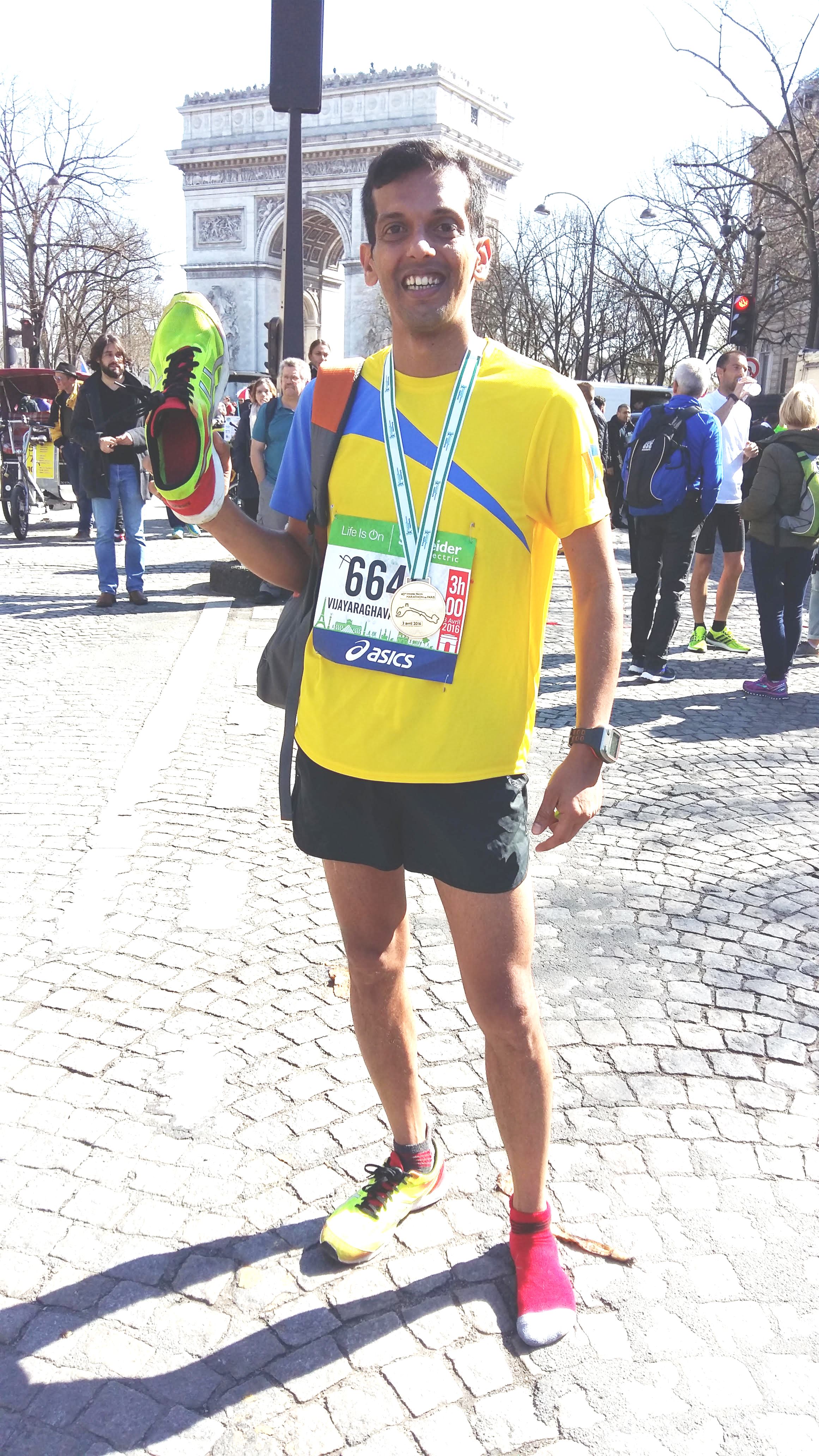 1896 is a special year in the world of sports. That’s the year the modern Olympic Games made their debut in Athens, Greece. Less importantly, it was also the year the first Paris Marathon – the Tour De Paris Marathon – was held. According to Wikipedia, the current Paris Marathon traces its origin to 1976. The event is normally held on a Sunday in April and participation is limited to 50,000 runners. The route is attractive, passing as it does through the heart of Paris. Vijay had decided that once he breached the 3:30-mark, he would try running overseas. He applied for the Paris Marathon of April, 2016. After a couple of weeks spent putting the DNF at SCMM behind him, from February onward, he started training for the Paris run. That month there was a half marathon in Delhi; he finished it in 1:23. Back in Bengaluru, he mostly trained alone for Paris. Once, Soji Mathew – the half marathon specialist from the Indian Railways – joined the training run to pace him. Soji has been a podium finisher at major events in India, in his chosen discipline. “ I like running with better runners,’’ Vijay said. During these training runs he was reporting timings like 3:02 for the full marathon. He went to Paris with a plan for 3:10. One good thing about being in Europe and US is that Vijay’s respiratory system functions well. He finished the full marathon in Paris with a timing of 2:59:48. It was his first sub-three. “ I was genuinely happy for it,’’ he said.