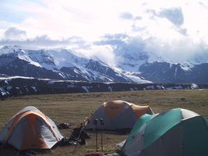 Camp 2; person in the picture is Nitin. Baljuri Col is to the right of the snow covered hump in the background (Photo: courtesy Araib Hasan)