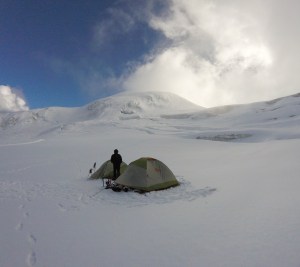 It was remarkable to look down at the peaks of the Alaska Range poking out of a cotton blanket of clouds more than a mile below us. Standing still, I could wear my face mask, and I felt strong. Each time I tried to walk all the effects of altitude return within a few steps. While our third was dealing with the altitude much better than we were, he realized even for him it would be a slow climb and we’d judiciously decided to descend together.
