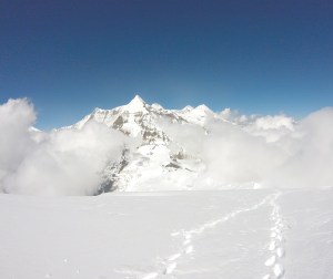 October 1 was to be summit day. Araib’s group set out from Camp 2 at 5.30 AM. There was deep snow for a while but overall they took less than an hour to reach the col. According to Araib, the route they took commenced a bit toward the side of Panwali Dwar and ran diagonally up to the col, avoiding the glacier’s bergschrund below. On the col, they paused to rest, melt water and have some hot drinks. From the col to Baljuri’s summit, it was a gentle slope albeit clad in deep snow and in portions, crevassed. The summit ridge, Araib said, was not very wide at start but quite broad leading on. Given Baljuri stands on the divide between Pindari and Sundardunga, the team could see Maiktoli (22,320 feet), the peak which dominates Sundardunga. They couldn’t see Nanda Devi from the col, Araib said. For that, another 300 meters or so of elevation gain was needed. Three team members – Araib, Adil and Nitin reached the summit at around 12.55 PM. From the summit, Nanda Devi was visible. They could also see towards Changuch and Nanda Kot. The team stayed for about 20 minutes on the summit; then turned back. On the return leg, Araib said, they had to be very careful while descending from the col to Camp 2, as the line of fall here leads to the bergschrund.