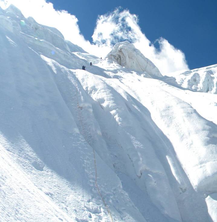 Under the snow was crevasse-wracked glacier, so we had to be roped up, but being tied together meant that with each step there was four-times the likelihood that someone would sink to the ankle, knee, or hip. When that happened, we all stopped.
