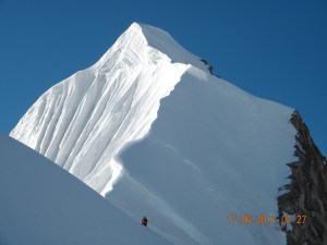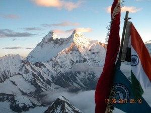 In the light of the successful ascent of Nanda Khat, Dr Gurtoo recommended to IMF that Dhruv be made an expedition leader. In March 2011, Dhruv was in Faizabad when he got the call from IMF confirming his appointment. He was to lead an expedition to Changuch. “ The Pindari Valley has been kind to me. That’s where my first real summit happened and I also got opportunity to work for the first time as deputy leader and leader,’’ Dhruv said. For the Changuch expedition, Dhruv didn’t have to look far for team. He had a tried and tested team from the Nanda Khat ascent. Further, Dr Gurtoo was scheduled to lead a team to Nanda Bhanar (20,459 feet) nearby. That put old friends in the same neighborhood. Given Dhruv’s Changuch expedition was a case of attempting its first successful ascent by an Indian team and first successful attempt from the Pindari Glacier side, he got to pick his team members first. He retained Bharat, Takpa, Wallambok and Chetan. Dr Anand Vaidya from the old Maiktoli expedition came aboard as team doctor. Total team strength was eight. There were no HAPs. They hired one person for the kitchen and three helpers for the passage to Zero Point. Dr Vaidya, one team member and the lone person on kitchen duty stayed put at ABC. The rest moved up self-sustained. The route up to Camp 1 was the same as used for the Nanda Khat expedition. At summit camp, Dhruv’s walkie-talkie stopped working as did his watch and altimeter. They found there, a snow stake from Martin Moran’s expedition, which they retained as memento. The team pitched two tents – a three man-tent and the tent Martin had gifted. For summit attempt, they left the summit camp at 11.30 PM. One team member stayed back at summit camp to keep refreshments ready for the summit party when they return. The summit of Changuch was reached at 9.50 AM on June 17, 2011. For Dhruv, it was a longstanding dream coming true. “ There are two ramps before the summit. At the first ramp, Wallambok said that it was his father’s death anniversary. The rest of the team therefore asked him to go ahead. All four of us – Wallambok, Bharat, Chetan and I – reached the top. Everyone cried. Takpa was last person up. He was bewildered to find a party of grown-ups crying on the summit,’’ Dhruv said laughing. Given Nanda Kot was covered in clouds it was difficult to compose a photograph as proof of ascent. So they left behind Takpa’s prayer flag and a snow stake with the names of senior climbers they had dedicated the climb to, inscribed on it. By 11 AM they commenced return. Takpa’s prayer flag could be seen through a zoom lens from lower camp. Dhruv dedicated the climb to Col. Joshi, Col. B.S. Sandhu, Nawang Gombu and C. Norbu. Their names feature on the snow stake left on the summit of Changuch. Dhruv didn’t rest content with Changuch in the bag.
