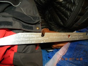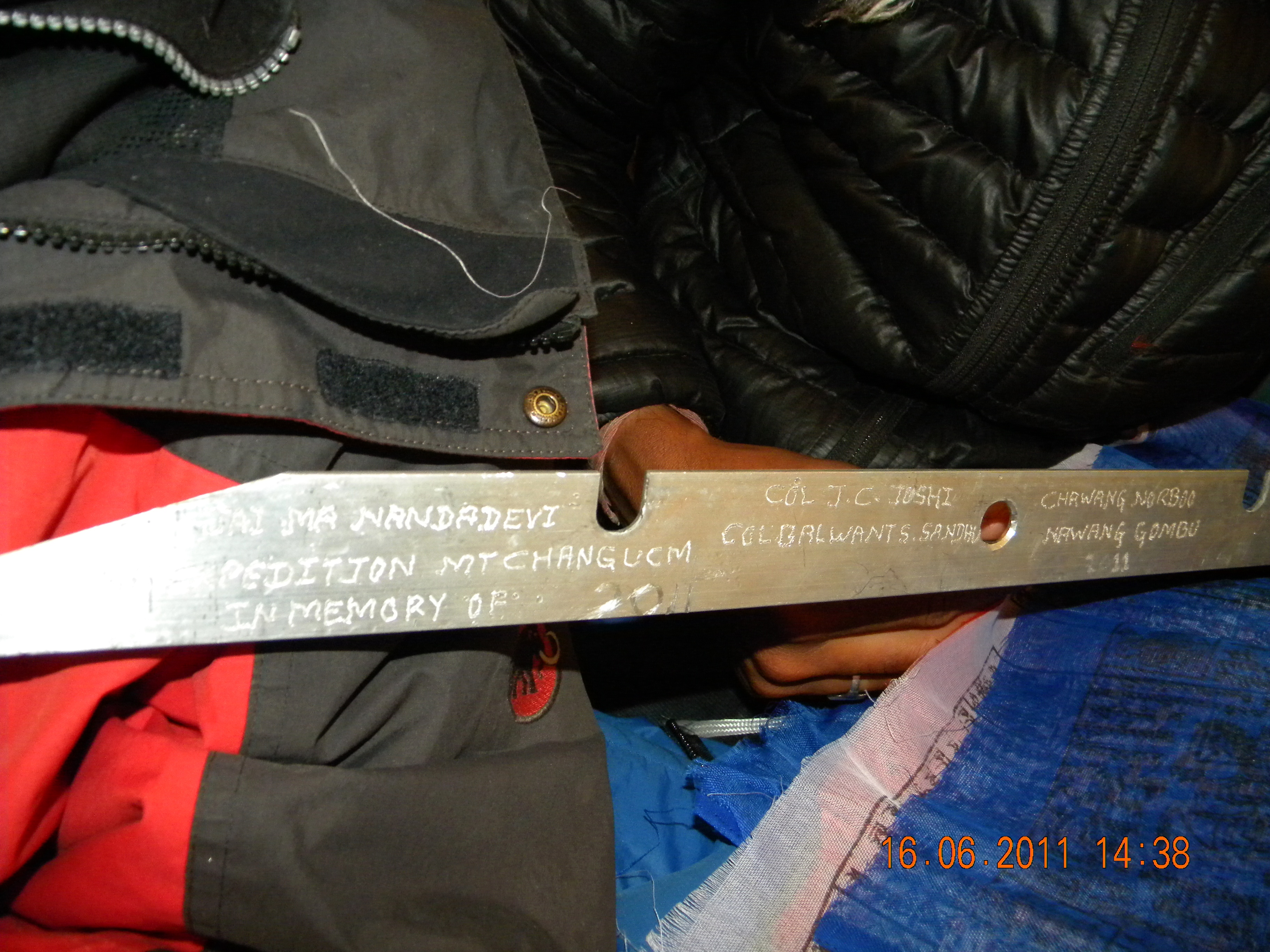 The snow stake which was left on the summit of Changuch. It has engraved on it, the names of senior mountaineers, to whom the expedition was dedicated (Photo: courtesy Dhruv Joshi)