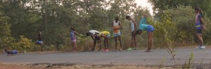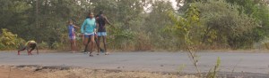 The village is perhaps three kilometers from the market in larger Vikramgad, a settlement between Wada and Jawahar. The quintet of four boys and one girl walked briskly to a small node ahead and then hung back to limber up. Roughly ten minutes later, the sound of runners’ feet approached from behind as the quintet trotted past at a relaxed steady pace. It reminded of every marathon’s initial phase – that rhythmic sound of feet striking tarmac and sense of pack when a bunch of athletes run by. There was no traffic on the small road save an occasional two wheeler. Once in a while the darkness was breached by torchlight or the approaching red glow of a lit beedi; farming chores commence early in these parts. Then two middle aged men came by on their morning jog. As the rising sun slowly made its presence felt, a lady walking briskly, appeared; followed by the sight of a man warming up for his jog, another who jogged by and then paused to do push-ups on the road. Dinesh Mhatre had said the day before that Vikramgad early morning has its growing share of walkers and runners. We were roughly 90 km away from Thane and maybe 120 km from Marine Drive, the showpiece of Mumbai’s running.