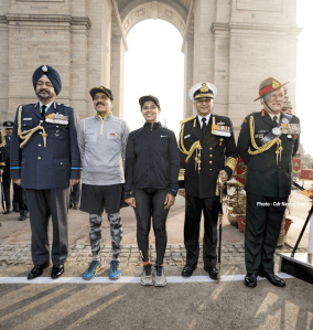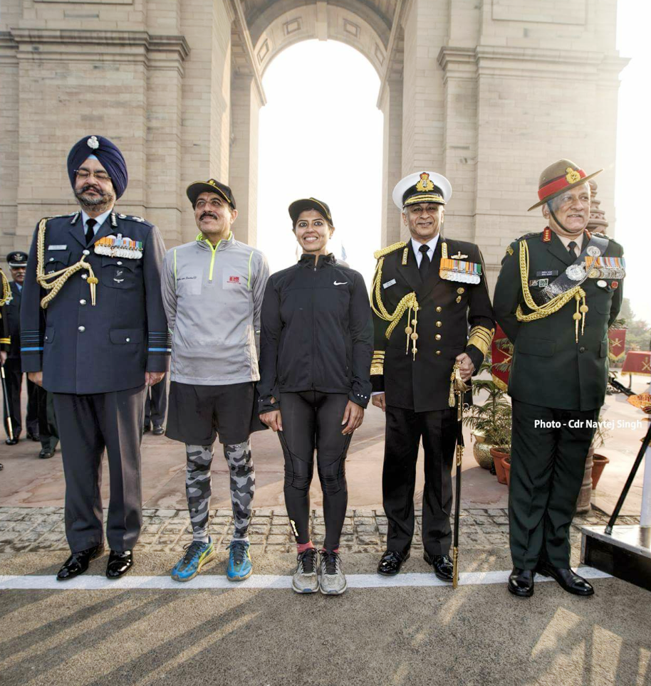 Meenal and Commodore Chandna with the three service chiefs – Air Chief Marshal Birender Singh Dhanoa, Admiral Sunil Lanba and General Bipin Rawat – on Army Day, at Amar Jawan Jyoti, India Gate, New Delhi. The duo ran 21 half marathons in the days between Navy Day and Army Day (Photo: courtesy Meenal)