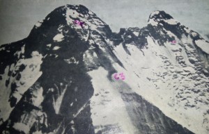 Nanda Devi Main / West and Nanda Devi East (right). Purple dots below the east peak denote where the bodies of Captain Premjit Rokhpa and Phurba Dorji were spotted just above the mouth of a crevasse (Photo: courtesy Group Captain Venugopal [Retd])