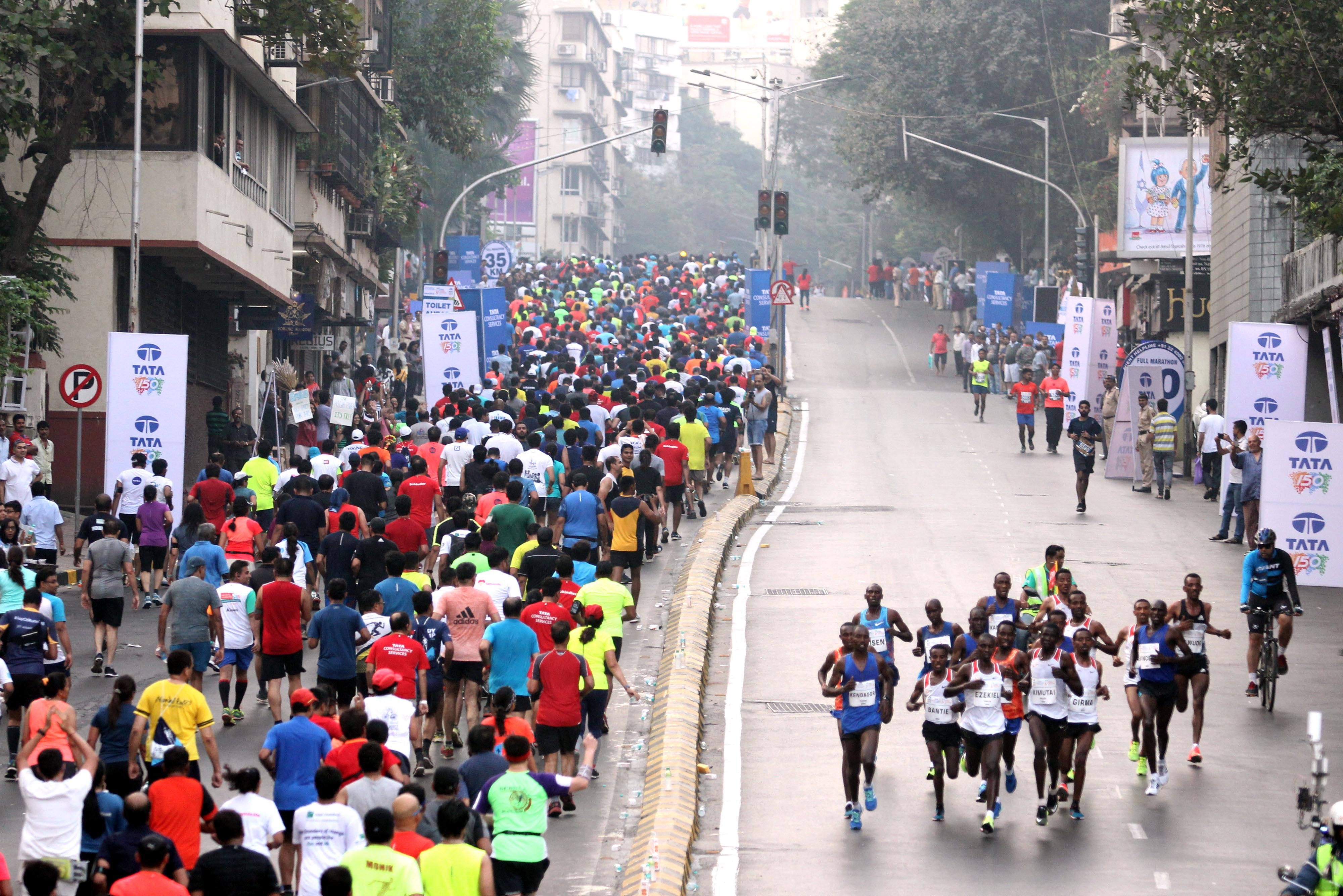 The 2018 Tata Mumbai Marathon (TMM) in progress; elite contingent on the right (Photo: by arrangement)