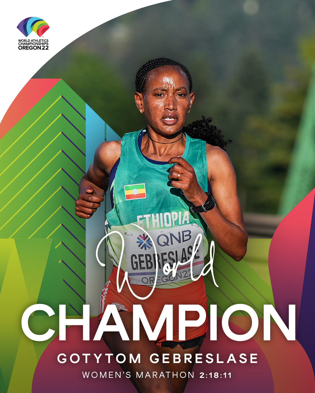 Gotytom Gebreslase of Ethiopia won the women’s marathon at the 2022 World Athletics Championship, finishing the race in a new championship record of two hours, 18 minutes and 11 seconds.