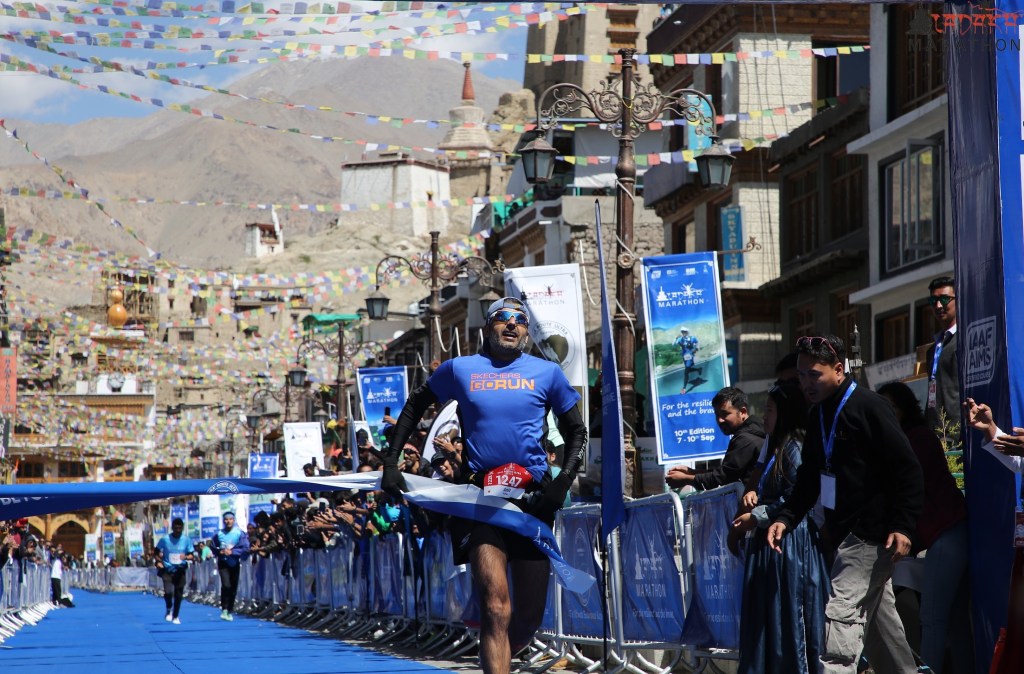 Amit Gulia crossing the finish line of the 2023 Silk Route Ultra in Leh (photo: courtesy Amit)