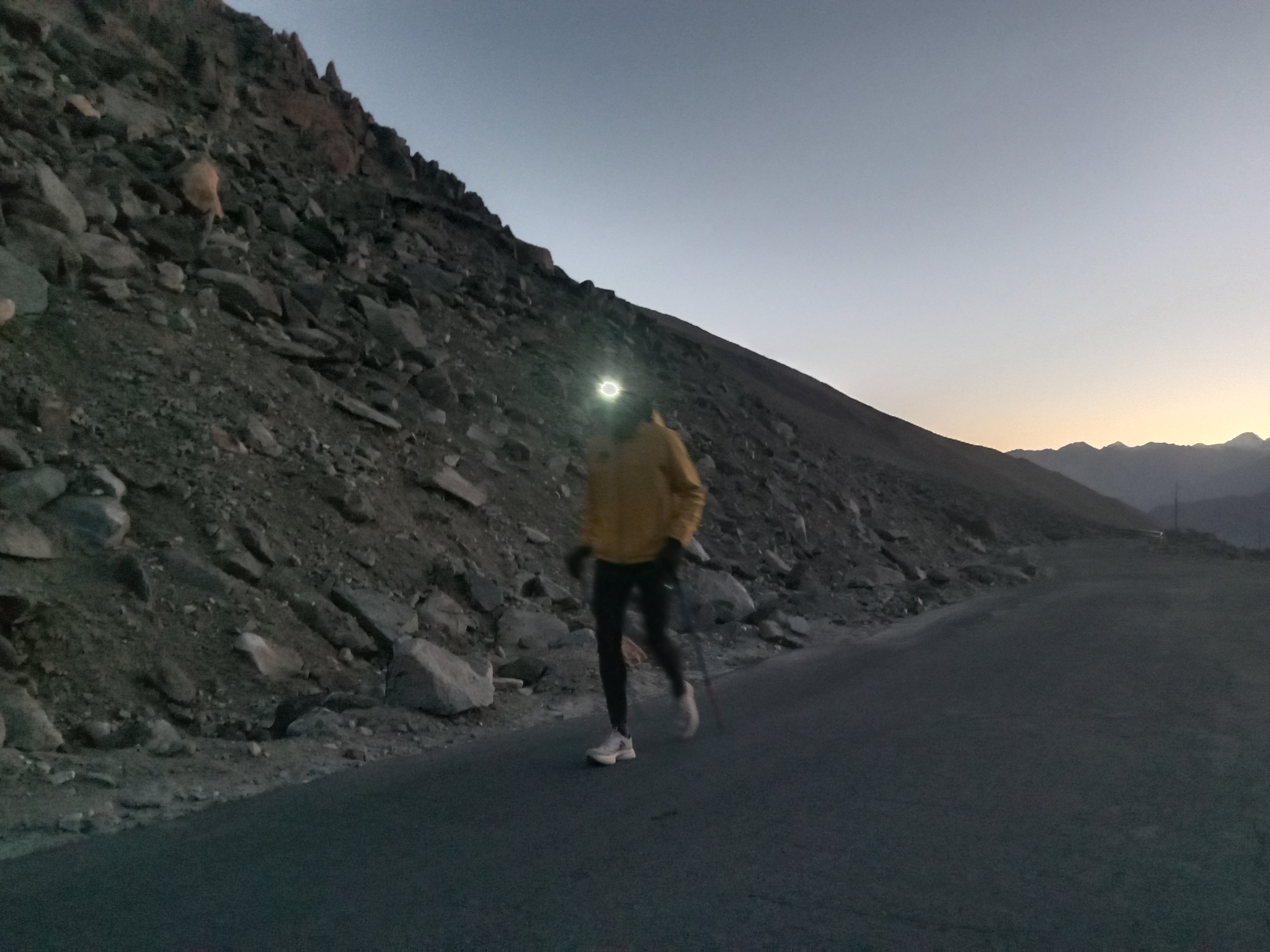 Early morning September 8. Amit Gulia at the very front of the 2023 Silk Route Ultra; location: between North Pullu and Khardung La, not far from the pass (photo: Shyam G Menon)