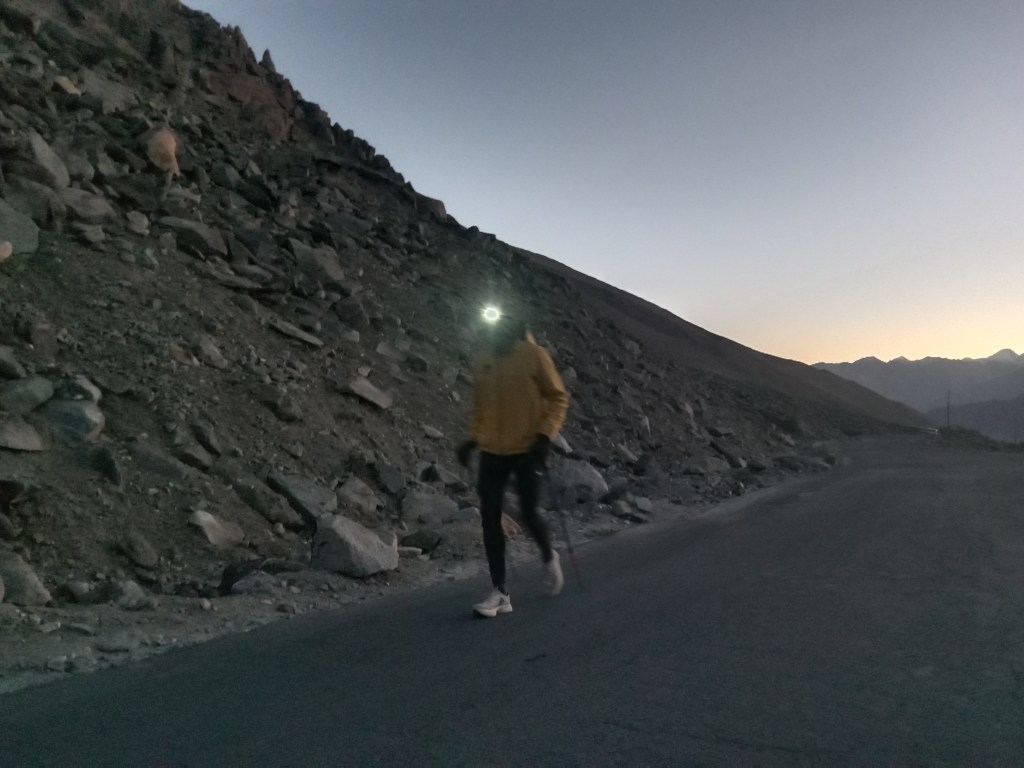 The group of runners Amit was in – the first batch of the race – had left Kyagar, late evening on September 7. Aside from the odd street light at settlements like Khalsar and Khardung, the road wound on and uphill in utter darkness. By the time Amit commenced tackling the uphill from Khardung village to Khardung La, it was past midnight. The North Pullu-Khardung La portion came some hours after that. Sizable gaps separated the runners. Some proceeded alone; some stuck together. With traffic suspended for the duration of the race, it was quiet. One heard the sound of athletes breathing, the swishing of wind cheater fabric and the sound of shoes on gravel, as person passed by. An occasional nuisance were dogs, some of them, territorial. Race officials, moving up and down the road, chased the animals away. Viewed from far, sole stamp of runner’s presence in that vast, dark mountainous landscape was, each person’s headlamp. In between, one saw the brighter solar lamps of aid stations. Amit was ahead of everyone else, all by himself. “ I was feeling exhausted. I was shivering like hell. I had on, two pairs of gloves, three jackets and two caps. I was finding it difficult to drink water from the bottle,’’ he said. Amit reached the 17,618 ft-pass almost an hour later than what he had planned. The pass is a tricky place. Given the stretch spanning North Pullu to Khardung La as the place where many people withdraw due to exhaustion, reaching the pass in SRU, represents a milestone achieved. But with that can come a loss of appreciation for where exactly one is. The pass is high in elevation and bitterly cold. There is an aid station at Khardung La, where one can hydrate, get some nourishment and also rendezvous with drop-bags positioned in advance. Runners like Amit treat Khardung La carefully; they don’t let the milestone bit get into their head. Hanging around unnecessarily at the highest part of the race does nothing useful to the body. The emphasis is on shedding elevation. With the environment quite cold, oxygen level at the pass known to be lower than at sea level and his body feeling fatigued, Amit picked up a glass of hot soup from the aid station at the pass and quickly moved on. Ahead lay the long descent to Leh.