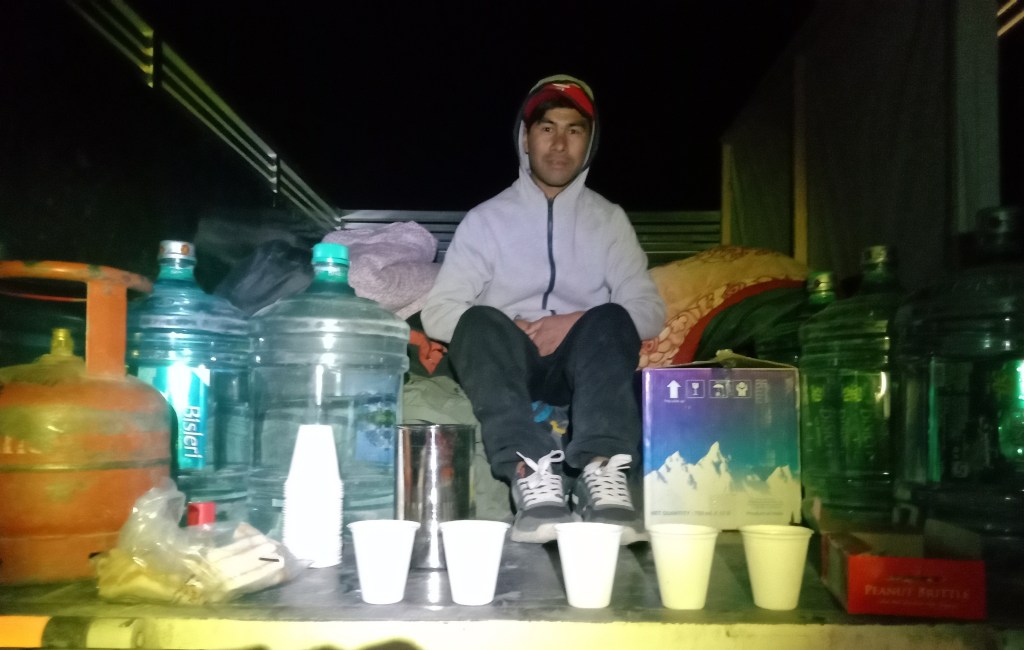 Midnight, September7-8; a villager manning an aid station on the cold northern slopes of Khardung La. This facility operated from the back of a pick-up truck (photo: Shyam G Menon)