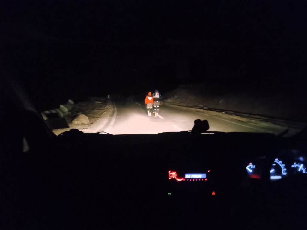 The general belief at this time in our vehicle was that the SRU race leader (as measured by being at the head of the column of runners) was Maik. Somewhere around this time, we had seen a faster moving line of headlamps work its way up the slopes near North Pullu and eventually overtake our parked vehicle. It was the lead pack of KC, an event long dominated by Ladakhi runners, especially personnel from Ladakh Scouts. Starting their race from Khardung village at 3AM, they had caught up with SRU. It was time for us to move further up towards Khardung La. Doing so, along the way, we passed the tall figure of Amit Gulia and realized we had incorrectly assumed for quite some time that Yangzam and thereafter Maik, was the SRU race leader. Amit had opened up such a lead that he held not even a stretched link to the SRU runners behind him. He was off on his own. Much before in the race, when the vehicle was keeping Thupten company in the Kyagar-Khalsar section, we had been informed of Amit being the first to go past Khalsar. Hours later, when we met him in the heights above North Pullu, he was still doing a steady but slightly tired pace and most importantly, distinctly ahead of the rest from SRU’s 7PM and 8.30PM batches. Assuming he kept that lead and finished first in Leh, he would still be up against the 8.30PM-batch of elite runners and their net time to finish. Past Amit, we found the leaders of KC working their way up.