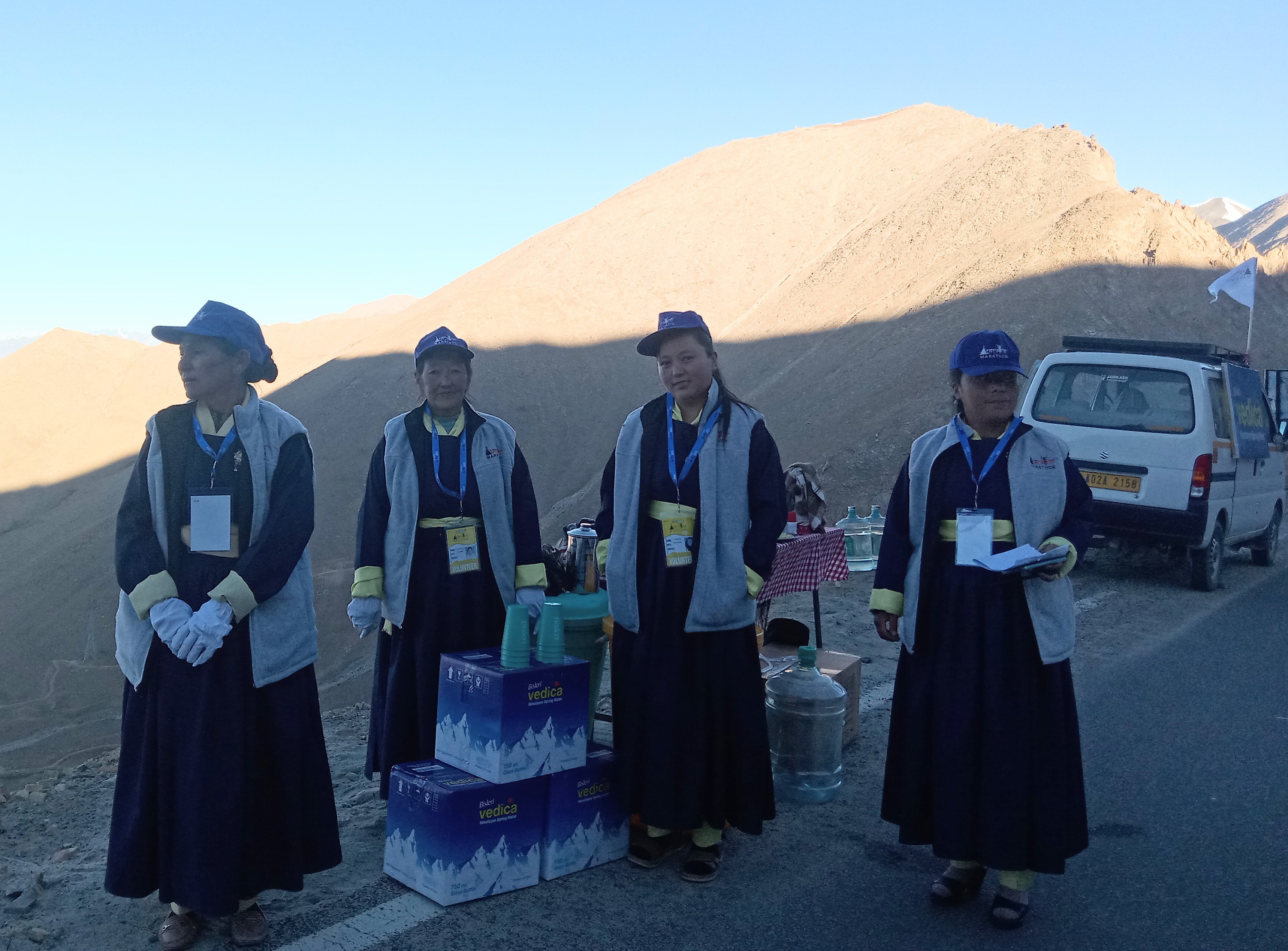 Morning of September 8; an all woman aid station on the sunnier southern slopes of Khardung La (photo: Shyam G Menon)