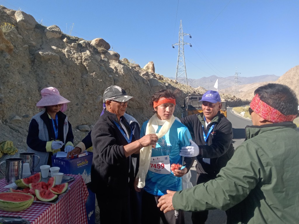 I never spend much time at the top and didn’t even see the garlic soup stall…! I had tried to eat and drink at every 7km aid station and also use my own gels, Enerzal and snacks in between. But at some point, I was no longer thirsty and hungry. And how many dates and bananas can you eat? I was able to run a bit towards South Pullu where I was enthusiastically welcomed and told I was strong running in third position. Shortly after that I noticed that I now really started tilting again. Based on last year’s experience, I knew that this was because of low oxygen level, and probably dehydration due to which there are changes in the spinal cord fluid which cause the ‘leaning’. I don’t know if the leanings happen on the stronger or the weaker side of the body. I knew I had enough time in hand to complete the race walking. I didn’t care about finishing third or last. I thought: ‘This time I’m going to collect that finisher’s medal and jacket’. Confident, with optimism and songs in my head, I took off. Soon I could see Shanti Stupa, knowing that it was still far away but that it would come closer with every step I took. I made repeated calculations as the kilometer signs on the road were not in synch with the details that Garmin was giving me. The sun was relentless and where was this Mendak Mor, our last cut off point, a question in my mind. On the road behind me I saw many other runners. I was not the last. I reached Mendak Mor with an hour in hand.